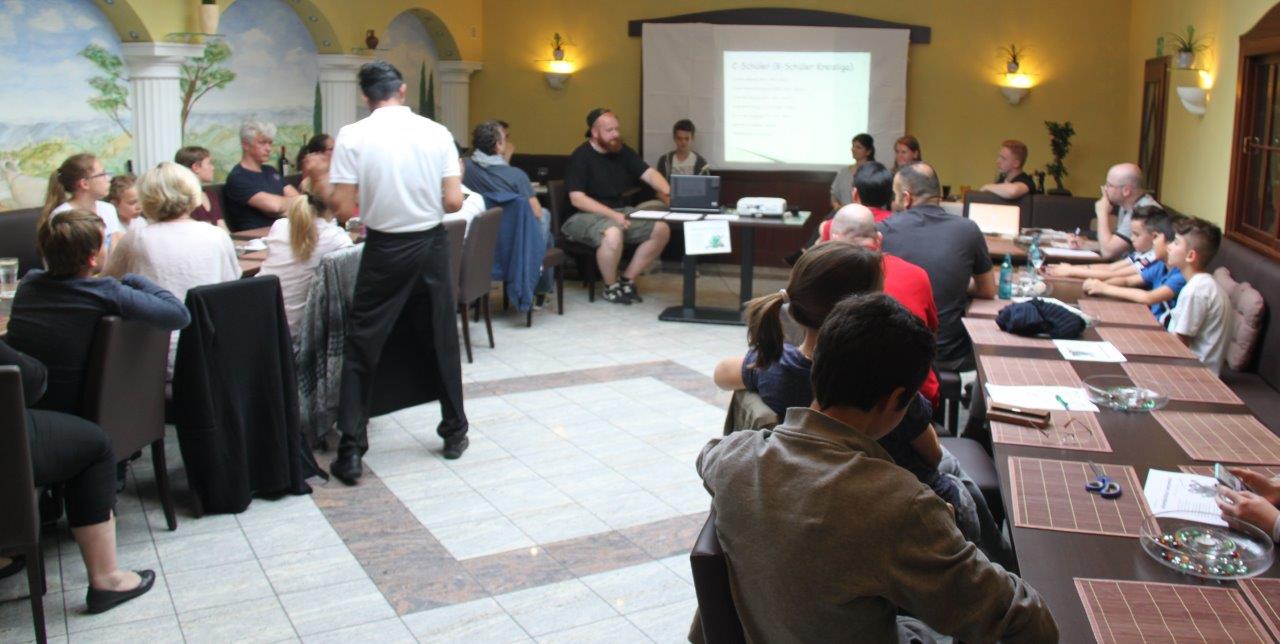 Pünktlich nach 1 ½ Stunden kamen die Erwachsenen hinzu, für die neben den Mannschaftsaufstellungen, der dieses Jahr stattfindenden Wahl der Abteilungsleitung (alle 2 Jahre) auch noch eine Menge brisante und aktuelle Themen zu besprechen und diskutieren waren. Abteilungsleiter Daniel Meßer führte durch das Programm. Die TSG will am Wochenende vor Weihnachten wie jedes Jahr wieder die Frankfurter Nachwuchspokalendrunde in der Spatzengasse ausrichten (Orga 2017: Sascha, Flo, Neuzugang Christian). Im vergangenen Jahr musste kurzfristig mit hohem Aufwand in die Gruneliusschule wegen dem Heizungsausfall in der Spatzengasse umgezogen werden (Orga 2016: Andi). Dejan berichtete für das Orgateam der Kreiseinzelmeisterschaften Nachwuchs am 16./17.9.2017 (mit Kevin, Regine) über den aktuellen Planungsstand. Die Veranstaltung wird höchstwahrscheinlich in der Carl-von-Weinberg-Schule in Goldstein stattfinden und es werden wieder zahlreiche Helfer_innen gesucht. Daniel und Thorsten berichteten vom geplanten siebenwöchigen Hallenumbau der Spatzengasse in und vor den Sommerferien. Flo hatte schon ein Helferteam für die Bauvorbereitungen organisiert. Im Sommer werden der Hallenboden, Tribünenunterbau sowie Türen erneuert und Prellschutzwände angebracht. Die Tischtennisabteilung erhofft sich dadurch auch bessere Lagermöglichkeiten für Tische und Banden. Für die Vorbereitung zur neuen Saison konnte erfreulicherweise mit dem befreundeten TV Bergen-Enkheim eine Verabredung getroffen werden, dass wir während der Umbauzeit 4 der 7 Wochen dort zweimal wöchentlich als Gast mittrainieren dürfen. Nachdem die Sanierung der Mühlbergschule seit mittlerweile über 8 Jahren angeküdigt war und immer wieder verschoben wurde, beginnt diesen Sommer nun tatsächlich der Abriss und Neubau der dortigen Sporthalle für 2-3 Jahre. Vergangene Woche musste sich kurzfristig ein Helfer_innen-Team finden, um die TT-Materialien dort mit einem Transporter abzuholen und im Keller der Spatzengasse einzulagern. Seit über einem halben Jahr hat Timo diverse Gespräche mit Sportamt, Schulamt, Saalbau, Schulhausmeistern und Gesamtverein wegen einer Ersatzhalle mehr oder weniger vergeblich geführt. Im Vergleich zum Umland fehlt es hier leider an entschlossener Unterstützung für die Vereine von Verwaltung und Kommunalpolitik (seit Jahrzehnten fehlen Sportstätten in Oberrad). Unmittelbar vor der Versammlung haben die Bemühungen zum Erfolg geführt, eine Hallenzeit einvernehmlich mit der Spvgg 05 Oberrad zu tauschen, wodurch das Systemtraining für Damen und Herren mit A-Lizenz-Trainer Marcel Müller weiterhin donnerstags angeboten werden kann – während der Sanierung in der Gruneliusschule in Oberrad.