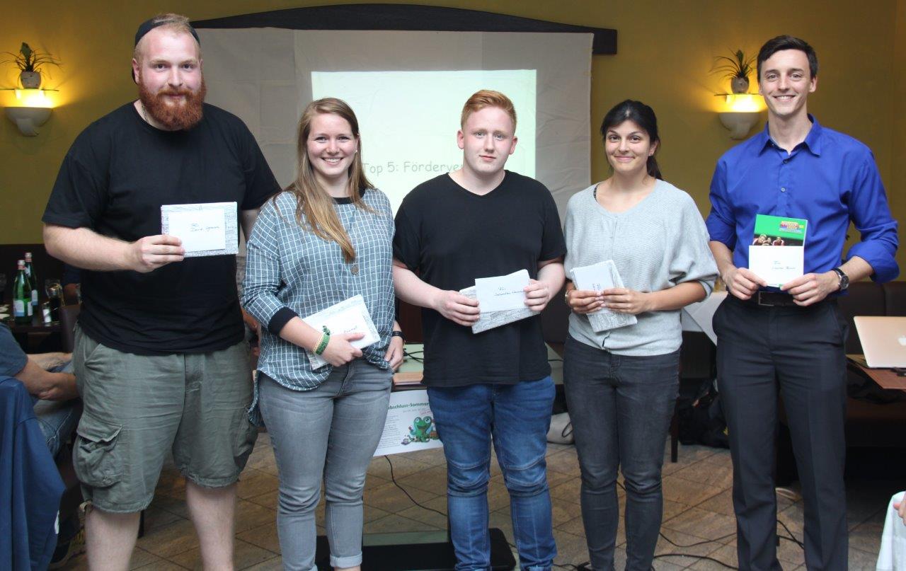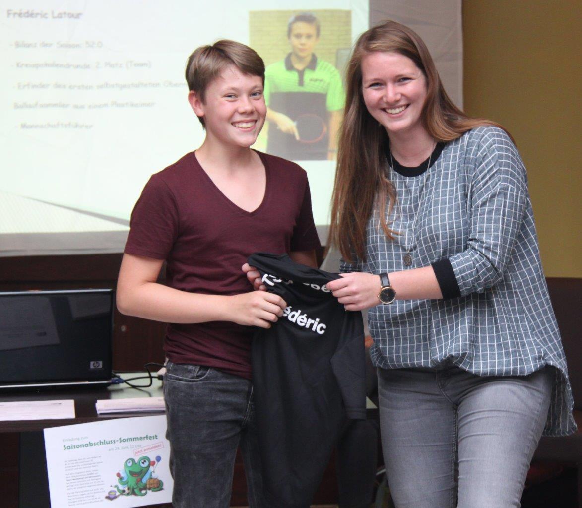 Nach der Begrüßung durch Abteilungsleiter Daniel Meßer führte Jugendleiter David Ugrenovic durch den ersten Teil des Abends. Zuerst wurde auf die vergangene Saison zurückgeblickt, bevor der Blick in die Zukunft gerichtet wurde. Als besondere Mannschaftserfolge wurden der Start der 1.Jugend auf Bezirksebene sowie die Endspielteilnahmen von 1.Schüler B und 1.Schüler C beim Kreispokal genannt. Drei Nachwuchsspieler_innen wurden für herausragende sportliche Erfolge geehrt und mit einem Trainingstrikot belohnt. Frederic Latour für seine Traumbilanz von 52:0 Spielen sowie seine Initiative, einen funktionalen Ballaufsammler für das Training aus einer defekten Metallstange, einem alten Eimer und einer Wäscheleine zu bauen. Karl Gustav Bergmaier und Marlene Tietjen jeweils u.a. für ihre Erfolge bei den Jahrgangsmeisterschaften (Titel Kreis Frankfurt, Vize Bezirk Südhessen, Teilnahme Hessen). Dann wurden die Aufstellungen und Betreuer_innen (David und Sabrina) der künftigen Nachwuchsteams vorgestellt. Die TSG Oberrad wird mit vier Nachwuchsteams in die Saison 2017/18 starten: 1.Schüler A (Kreisliga), 1.Schüler B (Kreisliga), 2.Schüler B (1.Kreisklasse oder Kreisliga), 1.Schülerinnen B (kreisübergreifende Mädchenliga). Die Jugendlichen werden für den Erwachsenenspielbetrieb freigeholt und in Damen- und Herrenmannschaften integriert, trainieren aber weiterhin auch beim Nachwuchs. Nach grundsätzlichen Hinweisen zur Verbandsrunde sowie den Aufgaben von Eltern, Kindern und Betreuer_innen, wurde die Bedeutung des Fördervereins für die Oberräder Nachwuchsarbeit betont. Während die ersten Beitrittserklärungen ausgefüllt wurden, stellten sich die neue Vorsitzende Kathrin Balogh und ihre Vertreterin Carola Tietjen den Anwesenden vor und überraschten das TSG-Trainer_innen-Team (David, Sabrina, Marcel, Naima, Sebastian, Nicolas) mit einem Geschenk als Dankeschön für ihren Einsatz und ihr Engagement für die Oberräder Tischtenniskids in den letzten Jahren. Angelika Kaminski wurde ein Blumenstrauß als Dankeschön für ihren 11jährigen Vorsitz überreicht und Ralf Reuther für seine Mitarbeit im Vorstand gedankt. Petra Gofran kümmert sich weiterhin um die Kasse des Fördervereins. Dann wurden noch strukturelle Veränderungen im Nachwuchstraining nach den Sommerferien vorgestellt (Hauptverantwortung David und Sabrina, Felix neu im Team) und die Trikotbestellungen der neuen Mannschaftsspieler_innen aufgenommen, bevor Naima das Programm des Sommerfestes am 24.6. im Scheerwald für Groß und Klein vorstellte. Sabrina berichtete noch von den „Tagen des jungen Engagements“ im Rahmen der TT-WM in Düsseldorf, bei denen am vergangenen Wochenende sieben TSG-Jugendliche und sie selbst als Referentin teilnahmen. Im Rahmen des Städteaustauschs der Stadt Frankfurt am Main erwartet die TSG im Juli Tischtennisspier_innen aus Lyon und Birmingham als Gäste, nachdem die Frankfurter Delegation letztes Jahr zu Besuch in Lyon war.