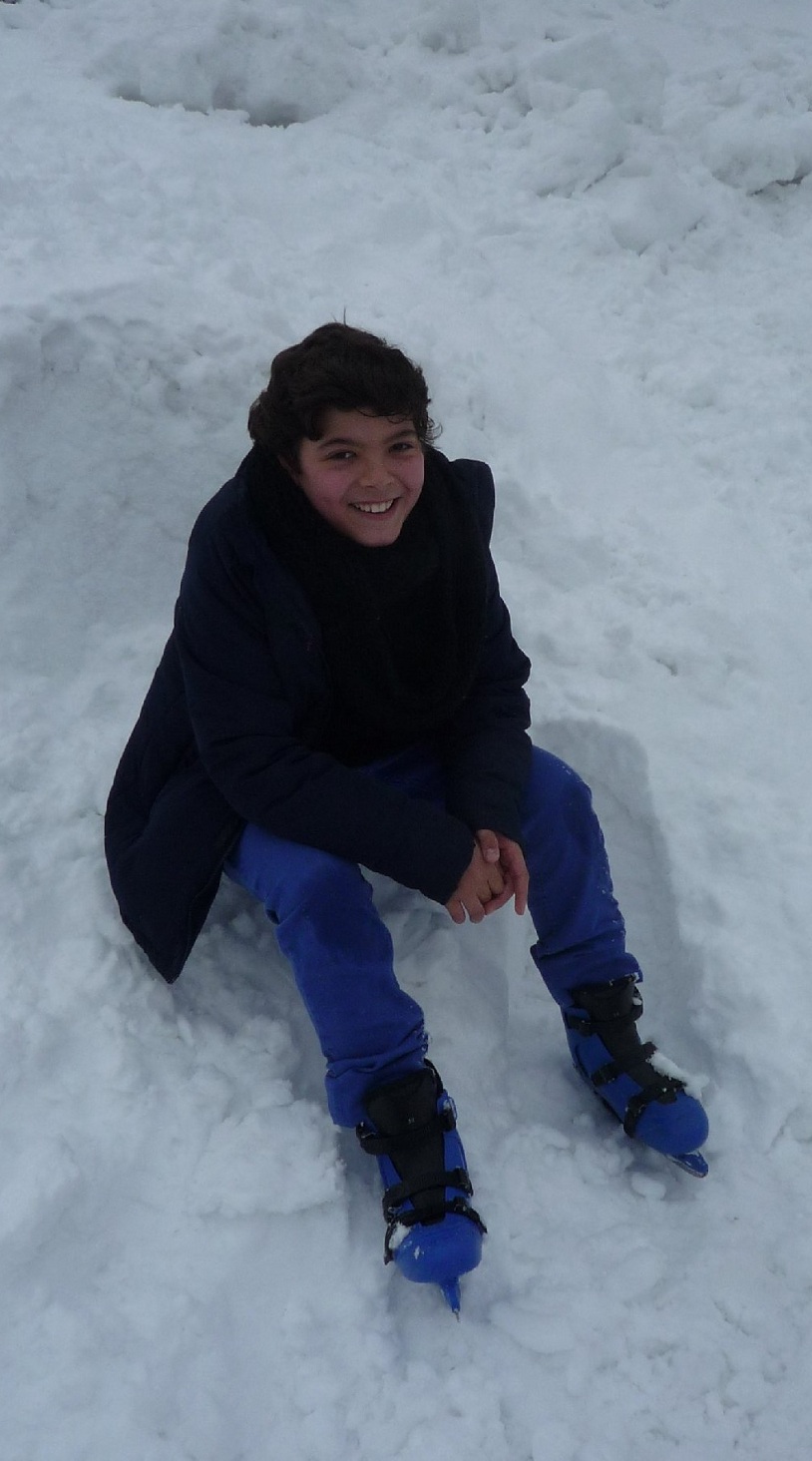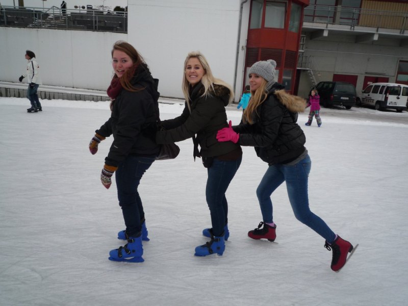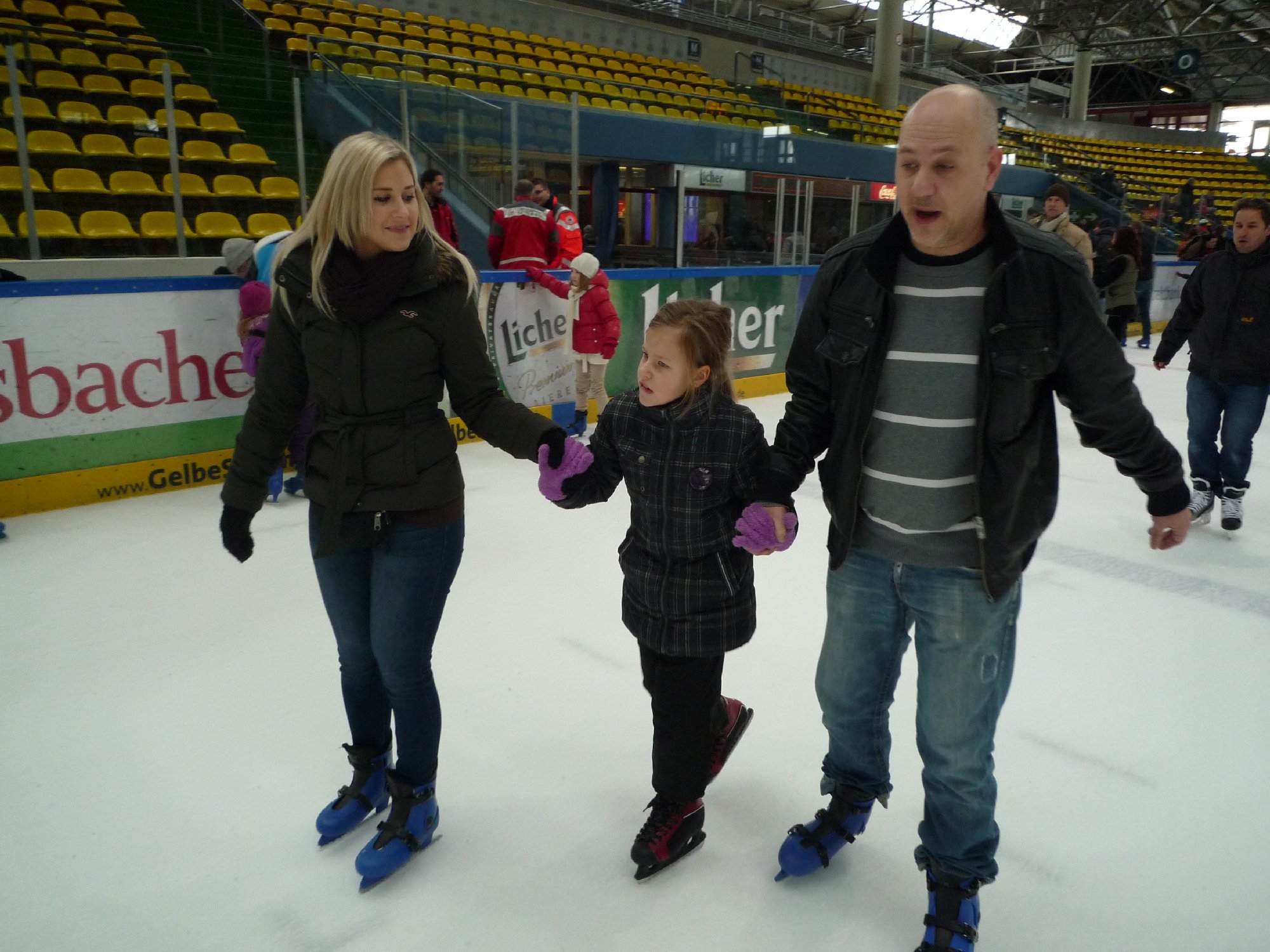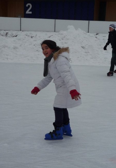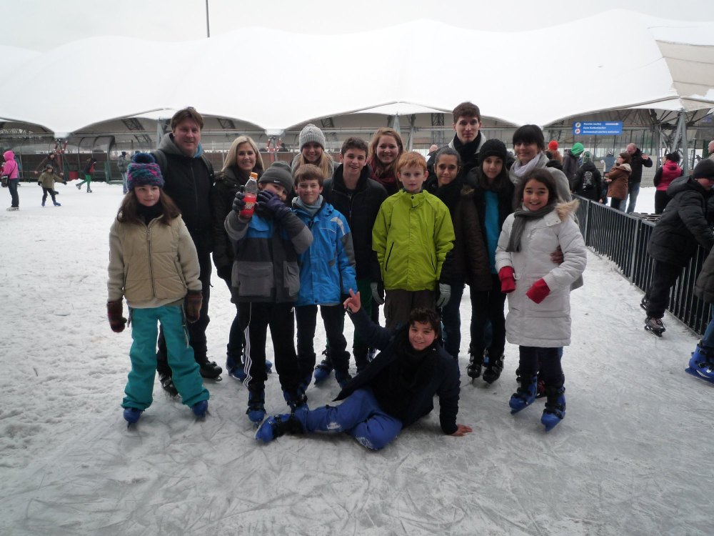 Am 27.01. trafen sich bei schönstem Winterwetter 24 TSGler zum fröhlichen Schlittern auf der Frankfurter Eisbahn. Während sich der Nachwuchs mit einigen Betreuern an der Turnhalle traf, kamen andere direkt an die Eissporthalle, wo sich um 11.30 Uhr schließlich alle warm eingepackt versammelt hatten. Als die Eintrittskarten gekauft und die Schlittschuhe in Größen zwischen 30 bis 46 ausgeliehen waren, machten sich alle daran, in ihre mitgebrachten dicken Socken und Handschuhe zu schlüpfen. Wenig später wagten sich alle auf das Eis, die einen sehr kühn, die anderen erst einmal vorsichtig. Doch alle hatten ihren Spaß – ob sie nun gleich wagemutige Kunststücke vorführten oder doch lieber vorerst mit der Bande oder Nenads helfendem Arm vorliebnahmen. Zwischendurch gönnte sich der ein oder andere eine wohlverdiente Pause auf der Bank, im Schnee oder in dem kleinen Imbiss. Die ambitioniertesten Eisprinzessinnen oder -prinzen durften um kurz nach 14 Uhr noch eine schnelle Runde auf der frisch geglätteten Eisfläche drehen, bevor dann um 14.30 Uhr der Heimweg angetreten wurde.