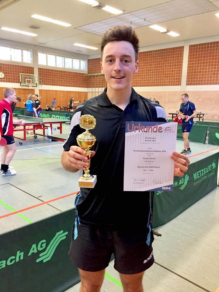 Für den Höhepunkt sorgte Nicolas Brown mit seinem Einzelsieg in der Herren D Klasse (bis TTR 1600, 49 Teilnehmer). Nach seinem Gruppensieg mit einer 2:1-Bilanz zog Nico in das K.O.-Feld der letzten 32 ein. In den ersten beiden Runden schlug er seine Gegner Podlich (Fehlheim) und Veit (Bad König) jeweils 3:0, bevor er sich im Viertelfinale mit 3:1 gegen Weiß (Sprendlingen) durchsetzte. Nach dem 3:0-Halbfinalsieg gegen Dingeldein (Auerbach) folgte dann ein umkämpftes Finale mit einem 5-Satz-Erfolg gegen Knye (BG Darmstadt), der gleichbedeutend mit dem Bezirksmeistertitel und der Qualifikation zu den Hessischen Einzelmeisterschaften am 13./14.5.2016 in Flieden und Neuhof im Bezirk Mitte. Im Doppel war schon im Achtelfinale zusammen mit Ex-TSG’ler Gairing (TG Offenbach) Endstation gegen die späteren Sieger Krämer/Ritschel (BG Darmstadt).