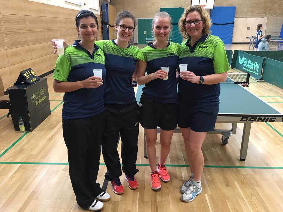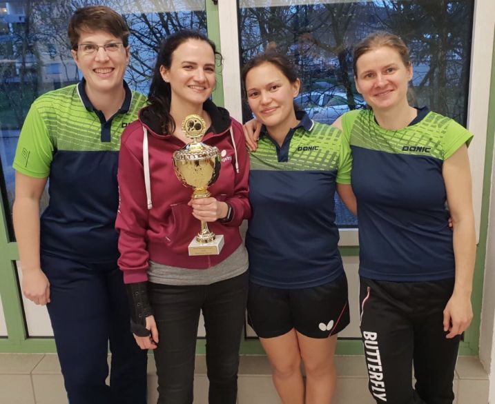 "Die D1 ging 2018/19 mit Vanessa, Naima, Franzi und Regine an den Start. Nach dem Abstieg in der Vorsaison gingen wir abwartend in die ersten Spiele in der Bezirksoberliga, wenn auch mit vorsichtigem Optimismus, da wir uns ja durch Vanessa auf Position 1 verstärkt sahen, die zuvor bei den Herren gespielt und die Damen nur bei Bedarf unterstützt hatte. Es begann dann auch erfreulich und überraschend deutlich mit drei glatten Siegen. Es folgten weitere, recht klare Siege. Die Vorrunde endete dann aber mit einer Niederlage: Gegen das toll aufspielende Team aus Bornheim unterlagen wir deutlich 3:8. Damit war das Ziel der Rückrunde klar: Durchmarschieren und am Ende noch Bornheim schlagen!