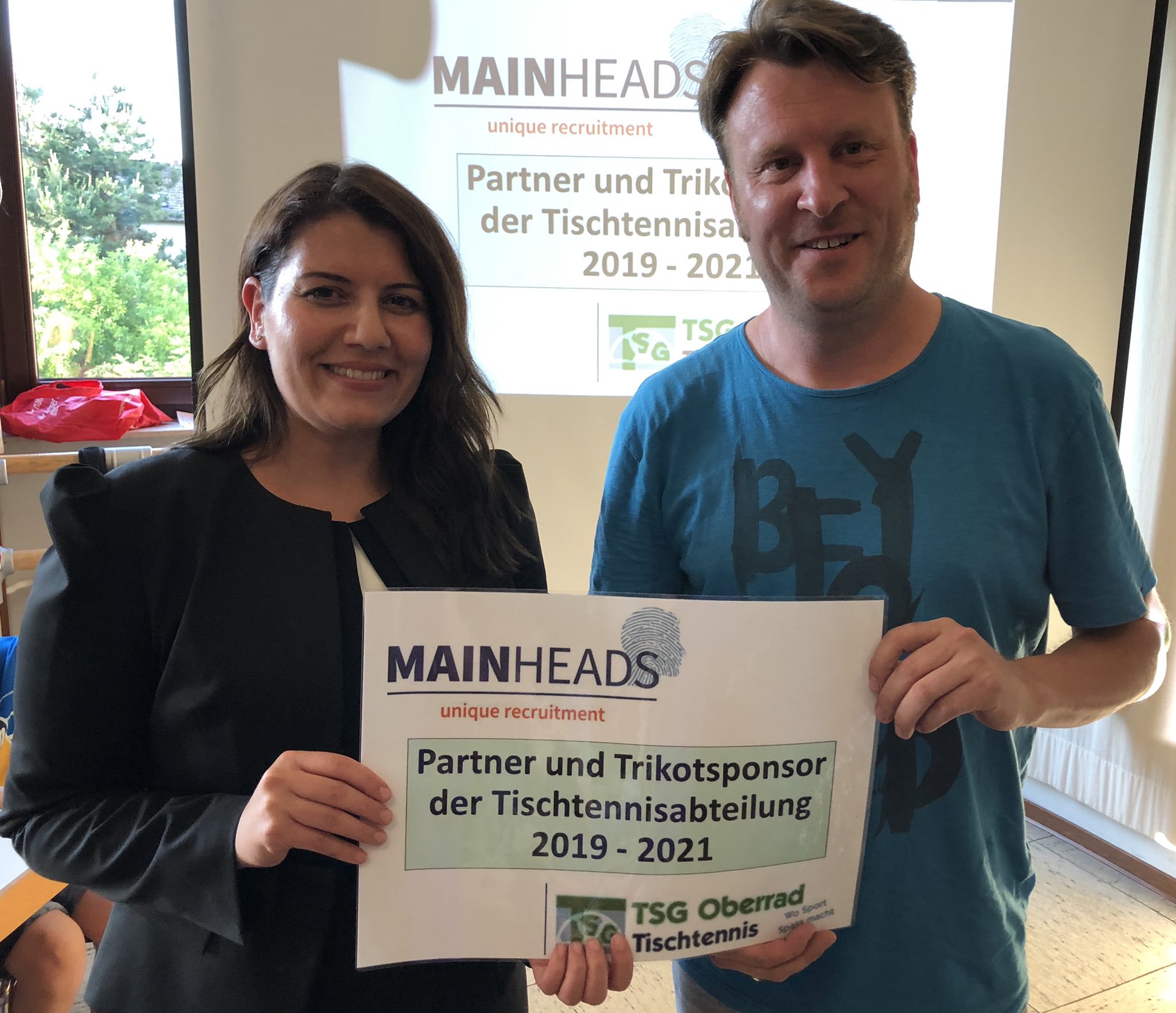 Anlässlich der Abteilungsversammlung am 5. Juni haben Geschäftsführerin Esra Çorlu und Abteilungsleiter Daniel Meßer die Partnerschaft offiziell besiegelt (siehe Foto). Frau Çorlu stellte den Mitgliedern der Tischtennisabteilung kurz das Geschäftsfeld von MAINHEADS vor – die spezialisierte Personalberatung für Fach- und Führungskräfte im IT- und Non-IT-Segment. Durch passgenaue Suche und Direktvermittlung werden die richtigen Mitarbeiter*innen und Arbeitgeber miteinander in Kontakt gebracht.