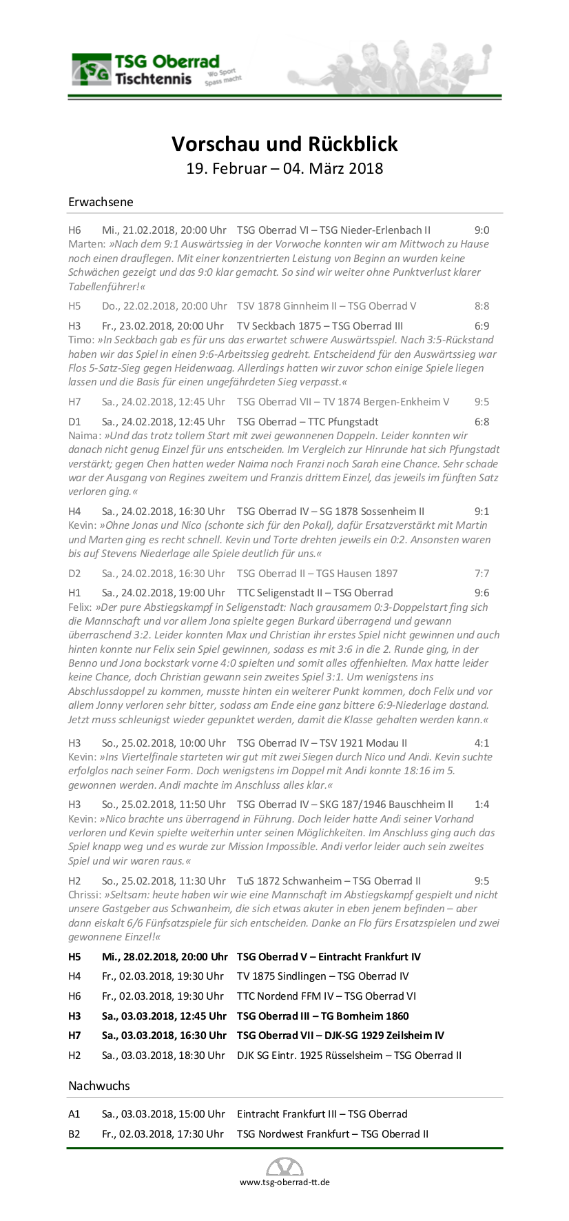 Vorschau und Rückblick (19. Februar – 04. März 2018)
