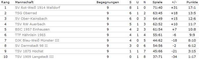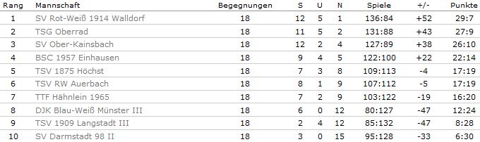 Abgesehen von den Spielen gegen den TSV 1909 Langstadt III (8:1) und den DJK Blau-Weiß Münster III (8:0), in denen ein klarer Sieg davon getragen werde konnte, hatten wir in der Vorrunde vor allem spannende und oft bis zum Ende in ihrem Ausgang offene Spiele zu bestreiten. Schließlich konnten wir uns jedoch gegen den BSC 1957 Einhausen (8:4), den TSV 1875 Höchst (8:6), den SV Darmstadt 98 II (8:6) und den TSV RW Auerbach (8:5) durchsetzen. Der Mannschaft vom SV Rot-Weiß 1914 Mörfelden-Walldorf sowie den Aufstiegskonkurrenten vom SV Ober-Kainsbach mussten wir uns in der Vorrunde geschlagen geben (beides 4:8). Vor allem die äußerst knappen Siege gegen die Mannschaften aus Höchst und Darmstadt und das Unentschieden gegen den TTF Hähnlein 1965 ließen keinen Zweifel daran, dass das Feld in diesem Jahr sehr ausgeglichen war.