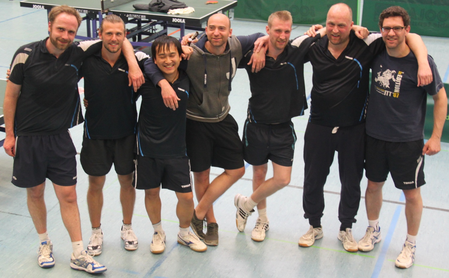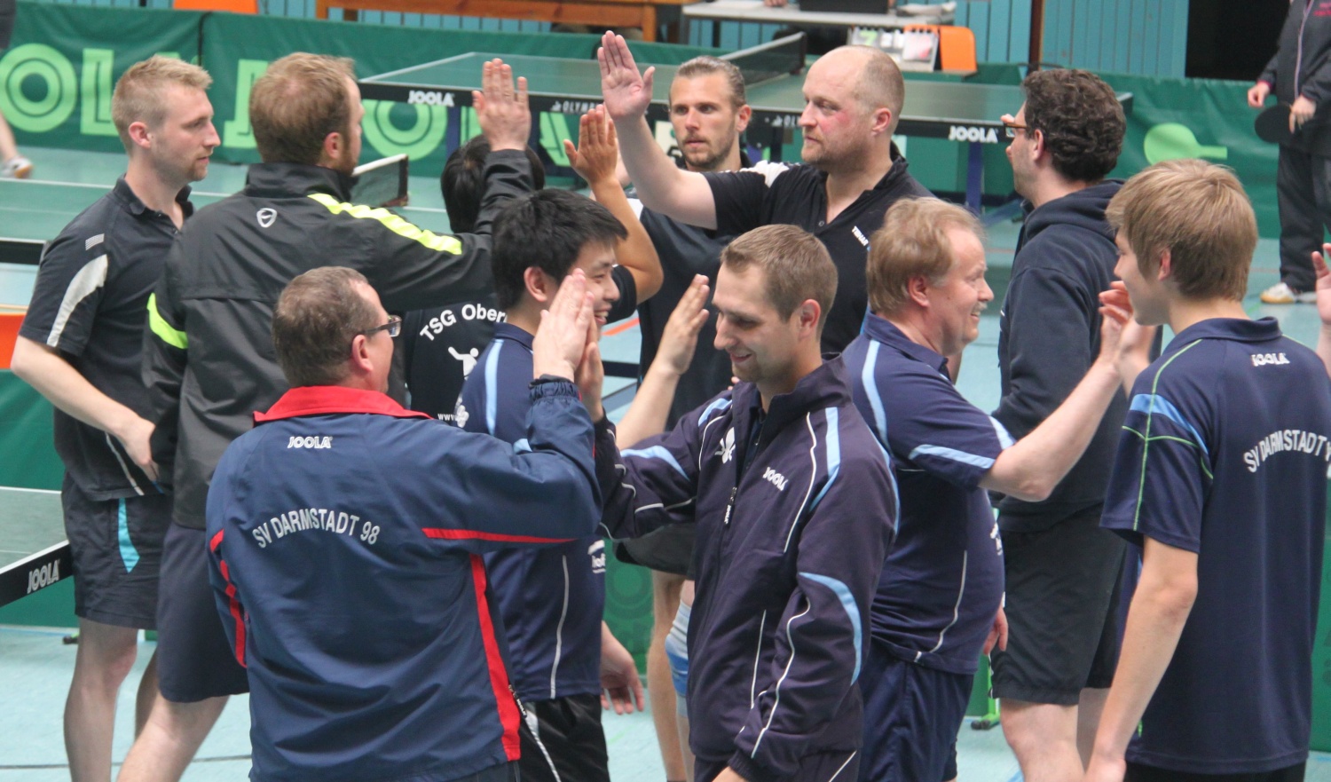 Nach einer kleinen Verschnaufpause für uns, einem Bierchen und dem verabschieden unserer tollen Fans (die per Live-Ticker immer aktuell informiert wurden) waren wir fortan nur noch Zuschauer und hatten es nicht mehr in der eigenen Hand. Gespannt verfolgten wir das Spiel Darmstadt gegen Höchst von der Tribüne aus. Darmstadt gab alles und führte 2:1 nach den Doppeln. Sah also schon mal nicht schlecht aus. In den folgenden 4 Paarungen der ersten zwei Paarkreuze gingen 2 Punkte nach Darmstadt, also hatte Darmstadt bereits 4 Punkte nach den ersten 7 Spielen erspielt. Höchst war unter Zugzwang und gewann folgend die nächsten beiden Einzel. Zur „Halbzeit“ stand es also 5:4 für Höchst. Im Spiel beider Einser gewann der Darmstädter souverän mit 3:0 in den Sätzen, also 5:5. „EINER NOCH“. Die Nr.2 von Darmstadt verletzte sich leider am Knie und musste sein Spiel verletzt aufgeben, 6:5 für Höchst. „EINER NOCH“. Die Darmstädter Nr. 3, den Stevie zuvor in 5 Sätzen besiegen konnte, holte „unseren“ letzten Punkt und glich für Darmstadt zum 6:6 aus. Damit war klar…egal wie das Spiel jetzt noch ausgeht, WIR SIND AUFGESTIEGEN!!!!!