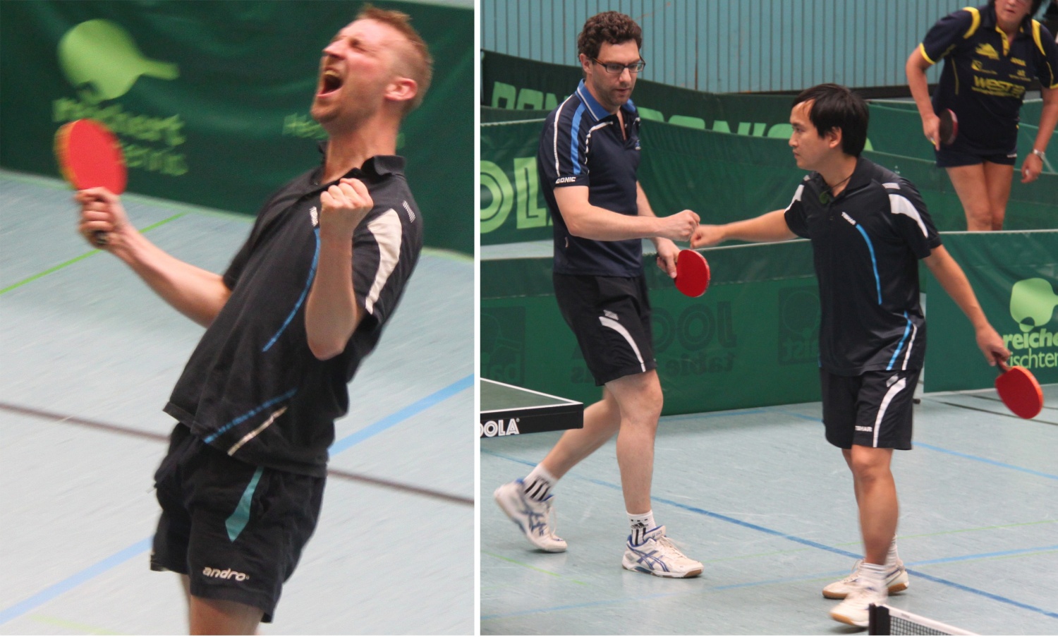 Jona/Marc spielten wieder auf höchstem Level und siegten erneut, nachdem sie das Spiel in mehreren Situationen scheinbar schon verloren hatten. Nach 0:2 Satzrückstand lagen sie im 4. Satz mit 5:10 und im Entscheidungssatz mit 6:10 hinten. Sie wehrten ganze 9 Matchbälle ab und gewannen beide Sätze mit 12:10. Die Tribüne „stand Kopf“ und der doch noch und schon wieder erspielte Big Point war letztlich Anlass genug jeden Zweifel oder Enttäuschung über den zuvor nicht erlangten Sieg gegen Höchst vergessen zu machen. Danke Jungs, super gemacht! Thanh und Stevie fanden diesmal sofort ins Spiel und lagen verdient mit 2:0 in Führung. Die Darmstädter konnten ausgleichen und somit ging es in den 5. Satz. Mit Nervenstärke und großem Engagement gelang ein knappes 11:9 im Entscheidungssatz.