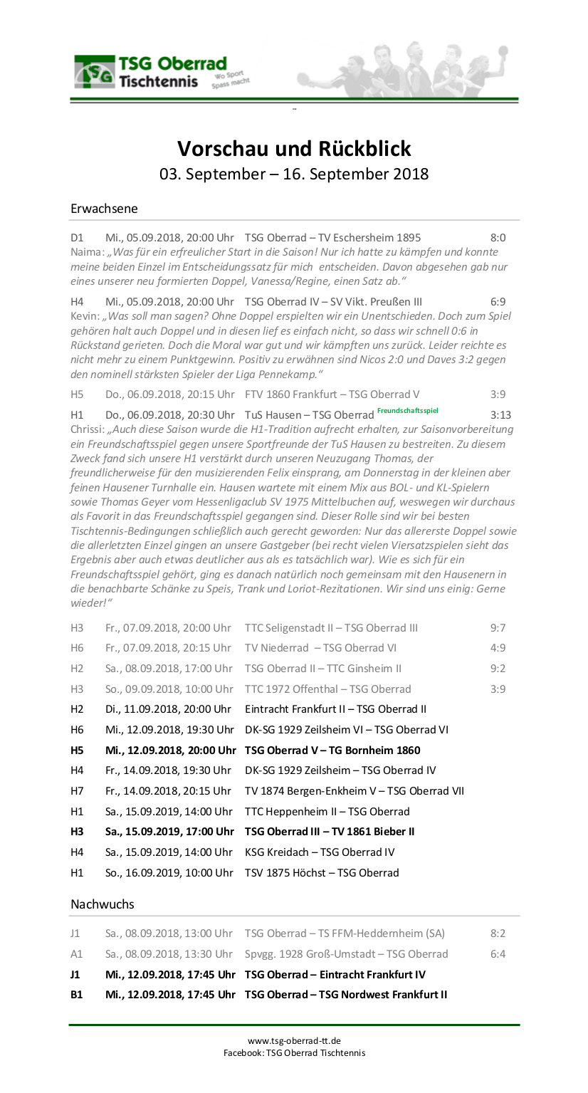 Vorschau und Rückblick (03.-16. September 2018)